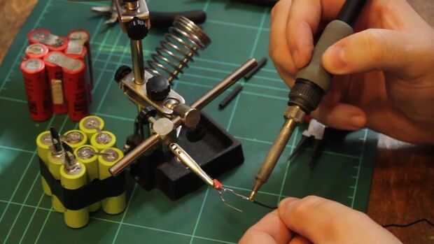 Después de soldar las pestañas, yo estaba dispuesto a construir la primera batería. Después de la limpieza las fichas de carga, entonces había soldado les el primer positivo de la célula y la célula negativo pasada.