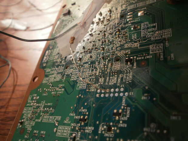 Para leer la NAND, que es básicamente el Sector de arranque de la consola Xbox 360, usted tendrá que soldar los cables a la placa base en puntos muy específicos. Para encontrar los puntos del diagrama en las primeras fotos, asegúrese de encontrar a la xbox y tapa la placa de base asegurándose boca abajo que se puede ver la parte inferior de los puntos que vas a soldar a. Sugiero que la placa base los bancos boca abajo porque los puntos son pequeñas protuberancias de soldadura elimina cualquier necesidad de añadir soldadura externa. También puse la pata de la resistencia en la placa madre porque eran más fáciles de colocar la soldadura en