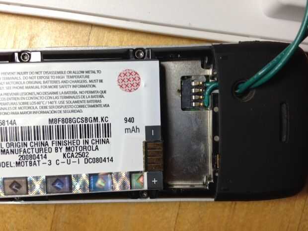 Luego probablemente necesite averiguar cómo puede obtener bajo los dientes terminales de la batería en su teléfono celular. En la mía, es bastante fácil. Ya hay un pequeño agujero que puedo deslizar mi cable verde y acaba de poner el extremo pelado de los 2 cables debajo de los dos dientes exteriores.