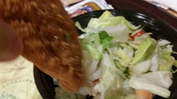 Abra su emparedado en el papel proporcionado. Luego sacar la lechuga y colocar en la ensalada. deshacerse de bollo. Siguiente lugar la empanada de pollo en el papel proporcionado.