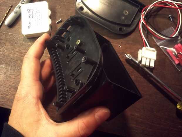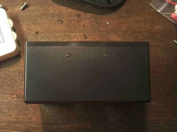 Perfore agujeros en el caso de Ember para los tornillos de primero por lo que no crask el plástico. Una vez que os adjunto la caja a la placa taladré un grande agujero aunque ambos pedazos de plástico, donde el termómetro y los cables van sin embargo.