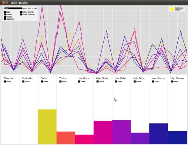 Calidad de la conexión, atención, meditación, Delta, Theta, alfa baja, alta alfa, Beta baja, Beta alta, Gamma de baja y alta Gamma.