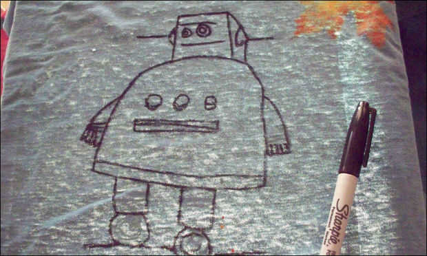 Aquí, colocar patrón en caja de luz para que puedo rastrear a mi camisa. Este es uno de los dos métodos que utiliza y el otro sigue con la camiseta negra. Usé un rotulador como se muestra y hace un preciso esquema del robot.