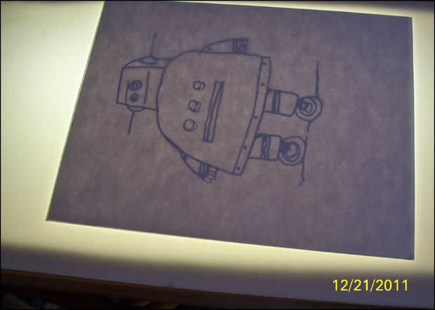 Ya que sería imposible trazar a través del material negro, tomé mi original patrón, utiliza la caja de luz, otra vez y trazado el robot en un pedazo de cartulina de 90 peso. Esto sería la plantilla usada para crear mi diseño.  Todo lo que tenía que hacer era pintura la zona de la plantilla y luego dibujar sobre eso con el sharpie.