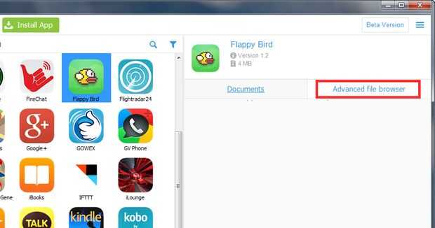 Paso 3: Seleccione el icono de pájaros Flappy de la lista y haga clic en "Avanzado explorador de archivos"
