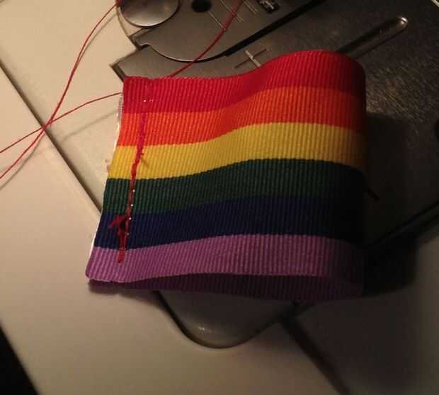 Doblar suavemente, sin prensar, la cinta del arco iris por la mitad. Puntadas a mano o con máquina. He utilizado hilo de rosca rojo, ya es el estándar utilizado en la medalla original.