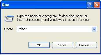 Ahora usted puede ir y descargar algunos programas de telnet. Pero ¿cuál es el punto de que? Mayoría de sistemas operativos vienen con construido en telnet. Para Windows, haga clic en Inicio -> Ejecutar (o tecla Windows + R) y escriba telnet en el cuadro. Se abrirá una pantalla de telnet.