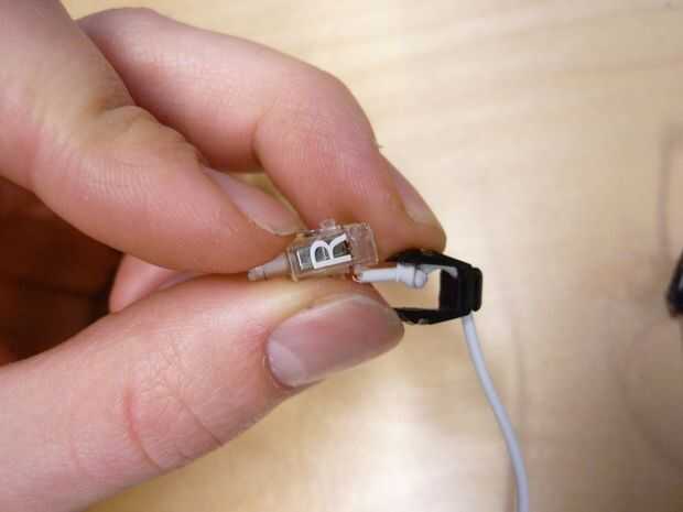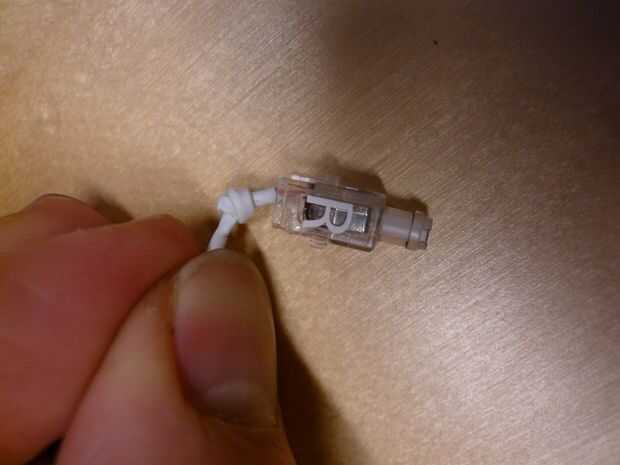 Ahora que tienes las almohadillas soldadas en, todo lo que tienes que hacer es volver a montarlos. Si tenía demasiado cable al final, seguir adelante y acortar ajustando el nudo. Ahora, tire de la cuerda por la parte negra de la carcasa como empuje hacia atrás la parte transparente de plástico en él, pero asegúrese de que el el cable está orientado correctamente: los cables en la parte transparente deben apuntar hacia abajo, y el cable debe salir de la parte superior de la caja negra. (El cable debe bajar desde la parte inferior de la parte clara, a la parte superior de la parte negra, luego otra vez a través y hacia fuera. Ver las fotos). Puede tomar un poco de esfuerzo, ya que el cable es un poco más grande y va a ser un ajuste apretado.