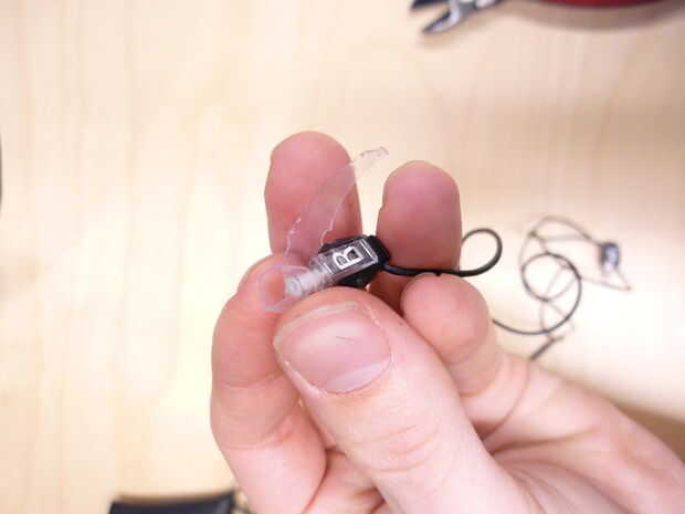Here goes! En primer lugar, saque los auriculares de la ER-6i. Luego, retire el alivio de tensión de cable plástico pequeño, usando las uñas o un bolígrafo fino para sacar fuera.   Ahora, corte la envoltura de plástico sobre el cuerpo principal de la almohadilla. Todo lo que necesitas hacer es hacer una pequeña muesca, y entonces podrá pelar apagado en una espiral (con las uñas o con unas pinzas de punta de aguja).