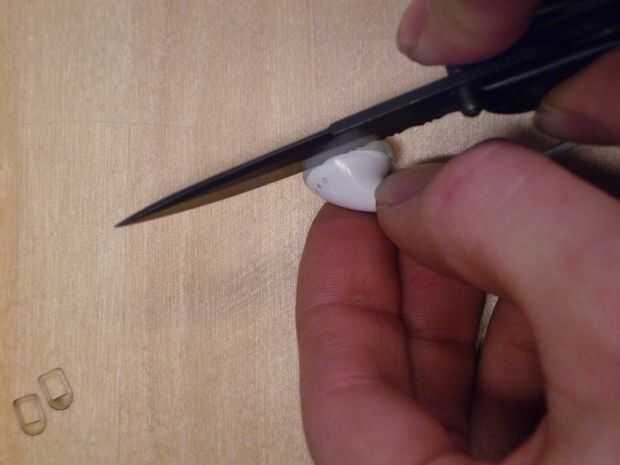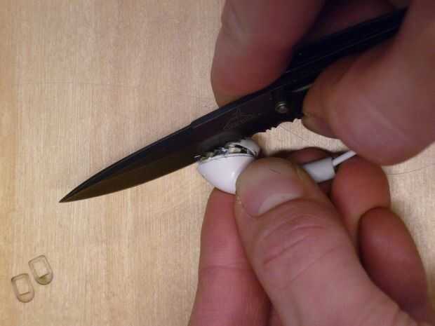 {quiera calentar el soldador en este punto} para abrir los auriculares del iPhone, tomar un cuchillo o una cuchilla de la tijera y presione hacia abajo y gire en la frontera entre el plástico blanco y anillo de goma. Les separe, tire flojo y desatar los cables. Asegúrese de hacer esto con cuidado y no deslizarse y cortarse.