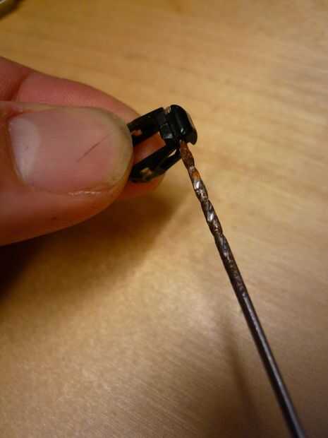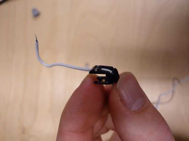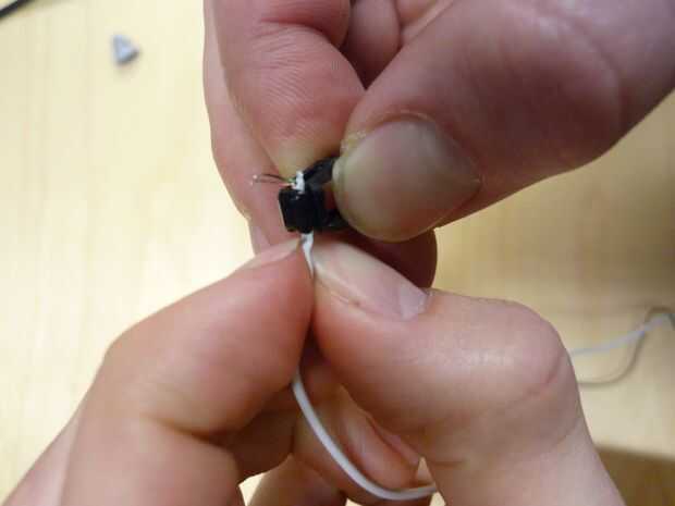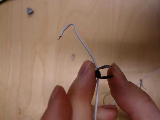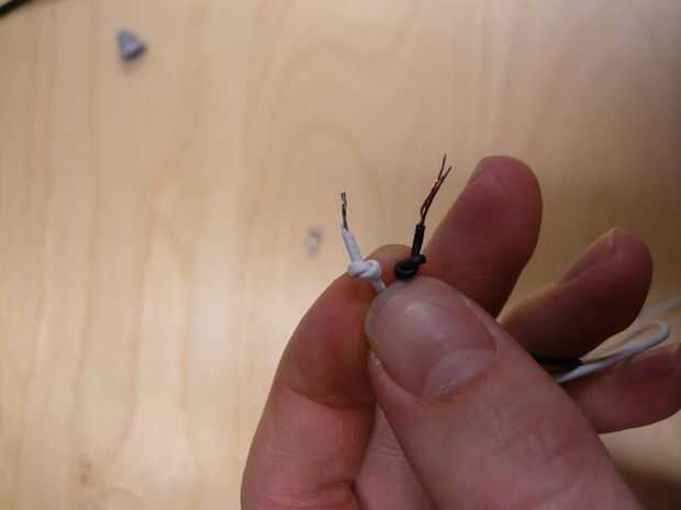 Ahora, usted necesita enhebrar los cables de audífonos de iPhone a través de la misma manera. La caja de cable blanco en los auriculares del iPhone es un poco más grande, por lo que puede ser * muy * paciente y mueva a través de (no tire de los cables pequeños, ayudan a no tirar la caja a través de), o puedes hacer el agujero más grande. Utilice el taladro de 1/16" de diámetro con la mano para agrandar el agujero. Esto hace mucho más fácil. Ver las fotos para el enhebrado correcto: quieres ir para arriba, entonces dentro de los audífonos. A continuación, haga un nudo. Deje unos 2-3 mm de la cubierta del cable de auricular antes de que los cables están expuestos. Demasiado y no encaja detrás; demasiado poco y no alivia el estrés.