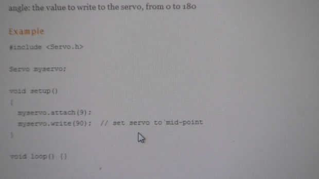 Usted tendrá que encontrar el punto exacto de null de tu servo. El servo en este instructable nulled hacia fuera en el 105. Cualquier cosa sobre la se convertiría en una dirección, y cualquier cosa por debajo de ella se convertiría en el otro. La velocidad máxima es de 180 en una dirección y 0 en el otro. Puede controlar la velocidad mediante el uso de valores en el medio.