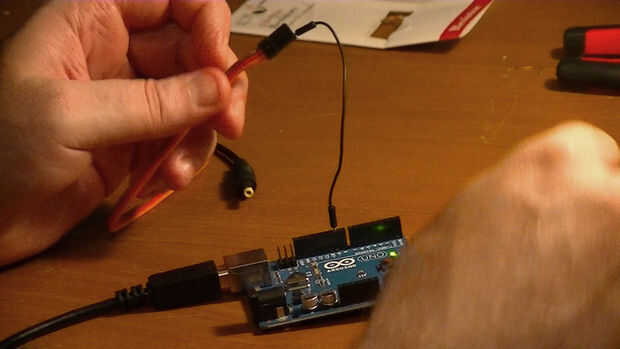 El conector de servo tiene tres cables - marrón, rojo y naranja.  Brown se conecta a la tierra del Arduino.  Rojo se conecta a 5V en el Arduino.  Naranja conecta con el pin de I/O en el arduino, en este caso digital pin 9.  Utilice los cables de puente para conectar entre los conectores hembra del cable de servo y cabeceras de Arduino.