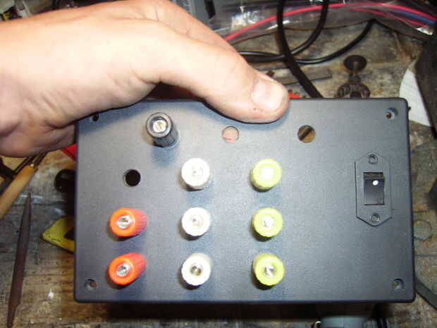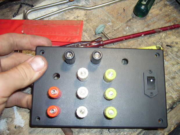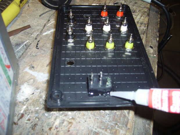 Ahora toma todos sus enchufes de plátano y tornillo en los agujeros que acaba de hacer ser Asegúrese de apretar totalmente. Luego agregarlo en el interruptor y pegamento o exoxy en.