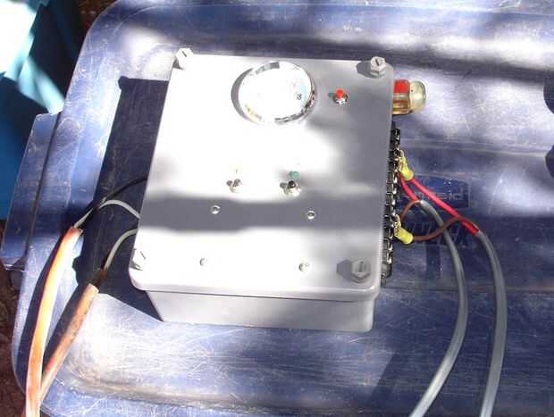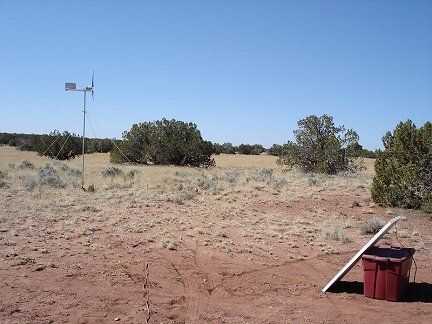 La segunda foto muestra la la nueva unidad de regulador de carga. Los cables en el lado izquierdo viene de la turbina eólica y paneles solares. Los cables en el lado derecho van al Banco de baterías y carga ficticia. Corté un cable de extensión resistente 100 pies viejo para hacer cables para conectar la turbina eólica y paneles solares para el controlador de carga. El cable de la turbina de viento es de unos 75 pies de largo y el cable para el panel solar es de unos 25 pies de largo. El Banco de baterías que actualmente estoy usando consta de 11 baterías de plomo-ácido de 12V de 8 Amp-capacidad conectados en paralelo. Eso me da 88 Amp-horas de capacidad de almacenamiento, que es mucho para acampar. Siempre y cuando sea soleado y ventoso, (casi cada día es soleado y ventoso en mi propiedad), la turbina de viento y paneles solares mantienen las pilas bien cargadas.