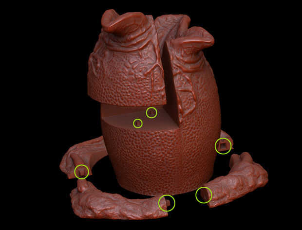 Cuando se realiza la modelización parte aún hay más que hacer! Aquí está mi opinión sobre la creación de algunos llamados "claves" sobre las piezas y también la creación de los guarnición "agujeros". Es una técnica que es ampliamente utilizada con diseñadores de juguete o sculpters. Se asegura que los objetos se encajan en el lugar correcto sin estropear. En la foto se puede ver las llaves y los agujeros, en un círculo verde brillante.