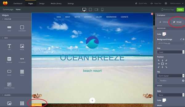 Como de costumbre, encabezado contiene tales elementos esenciales de la web como una insignia de la compañía, su título y un menú de navegación. En primer lugar, arrastrar y soltar el widget contenedor. Es necesario anidar esos tres elementos a la estructura de su sitio Web. Antes de la anidación en sí mismo una imagen de fondo. Haga clic en la sección "Diseño" en las propiedades del contenedor, situado en el lado derecho. Aquí puede configurar tamaño y posición de la imagen de fondo.