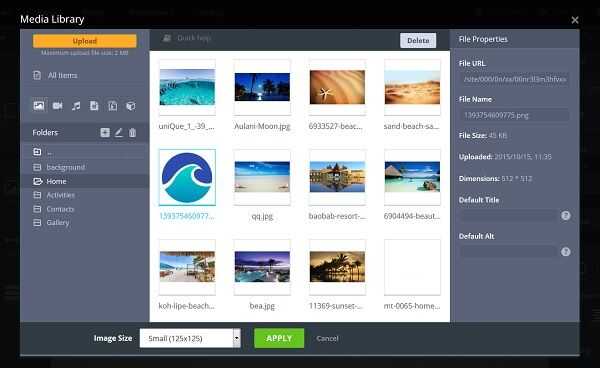 ¿Mi logotipo de sitio web de playa resort? Aquí viene el widget de imagen. Debido a la misma vieja arrastrando y soltando la coloqué debajo del menú de navegación. La imagen de la etiqueta es sencilla. Entre la configuración de este widget se encuentra un pequeño icono de lápiz. Hacer un clic y se abrirá la biblioteca de los medios de comunicación. Permite subir varios archivos, no sólo imágenes, sino video, audio, archivos, documentos etc.. Por cierto, mi imagen de fondo de cabecera fue subido de la misma manera.