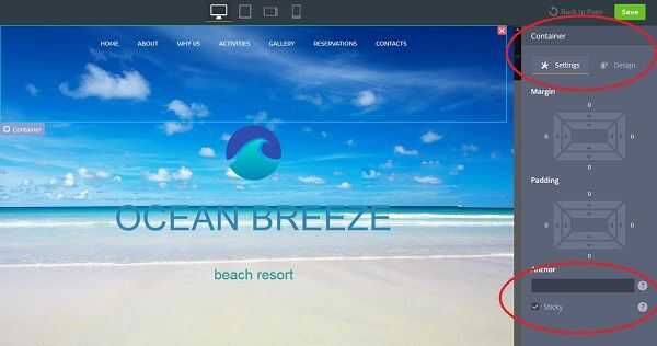 También es posible hacer el menú de "pegajoso". Este truco es perfecto para mi sola página web, debido a la ausencia de otras páginas web y sitio web largo desplazamiento. Encontrar esta opción en la configuración del recipiente y llene una caja apropiada. A partir de ahora mientras se desplaza a la página web, el menú será siempre a la vista.