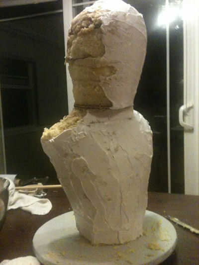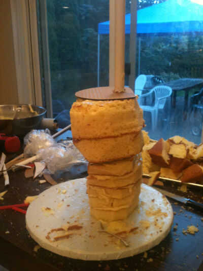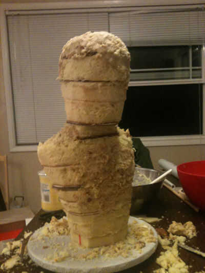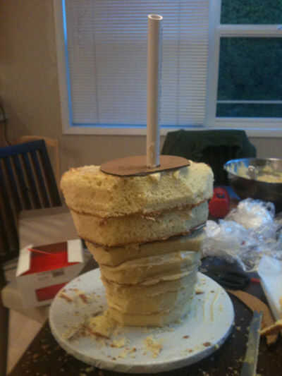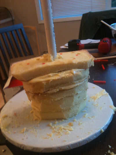 Una vez todas las capas han sido apiladas y tallada, me cubre la torta entera en crema de mantequilla y ponerlo en la nevera durante la noche para enfriar antes de cubrir de fondant. * Tenga en cuenta, tuve que tomar casi todos los estantes de mi nevera para conseguir el pastel a caben.