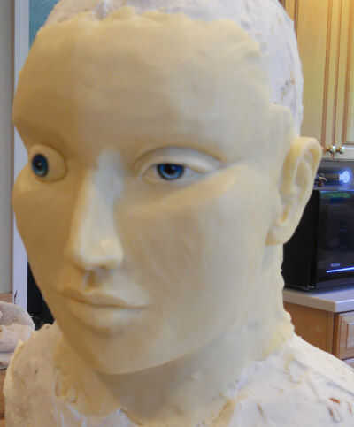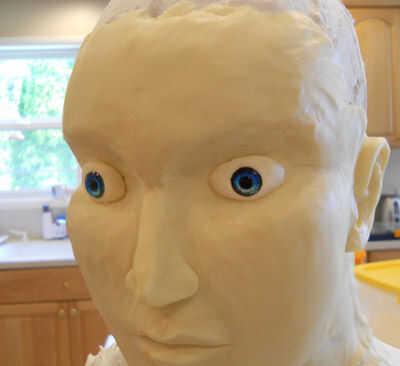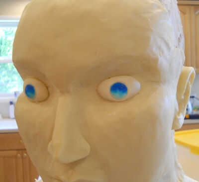 Me lleno a la pupila con colorante alimentario negro, así como alrededor de los bordes. Usé un poco de blanco colorante (base agua) para añadir un pequeño resalte a la pupila. Por último se utiliza más modelado de chocolate para crear los párpados superiores e inferiores.