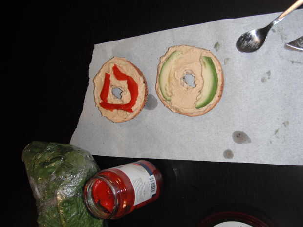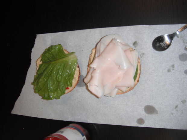 Cortar el panecillo por la mitad y difundir hummus en ambos lados.  Rebanadas de aguacate de lugar en una mitad y pimienta rebanadas en el otro.  Poner la lechuga y Turquía en el sándwich.