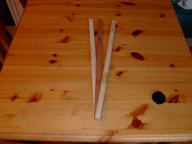 Si usted vive en un bosque de madera dura, omita este paso, no tendrás ningún problema. El resto de nosotros con un presupuesto ajustado tiene que ver con lo que encontramos sobre el lugar. Básicamente, necesitas 3 pedacitos de madera, usé un strpie central más oscura de la madera, pero puede utilizar los diferentes 3. Sólo se ve mejor con la tira para arriba de la media. Buenas fuentes de madera sería un woodyard y pedir recortes. Algunos muebles se hacen de madera dura, pero que es caro. He utilizado 2 brocas de espiga redonda mitad de.75 de una pulgada de ancho y.5 pulgadas de espesor, la tira fue.25 grueso y sobre el mismo ancho. Asegúrese de usar madera dura. Para comprobar si la madera dura de la madera, prensa youe uña a una arista. ¿Fácilmente hunden en? es no, trata de doblar la madera. ¿Es rígido, pero aún lo suficientemente flexible como para doblarse sin romperse? Si pasa ambas estas testa, lo más probable es que es conveniente. No use pino.