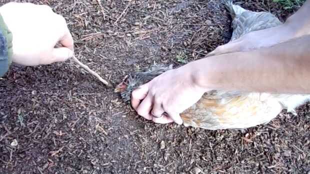 Haciendo movimientos rápidos con una pequeña ramita, trace una línea sobre un pie lejos de la cabeza de pollo.