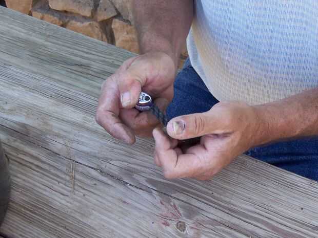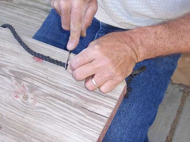 Yo primero fundido al final de mi cuerda con un mechero y exprimido junto al final para celebrar (hacer esto solamente si la cuerda es de poliéster), hará allí donde han cortado.