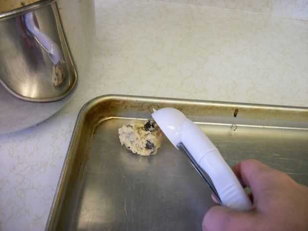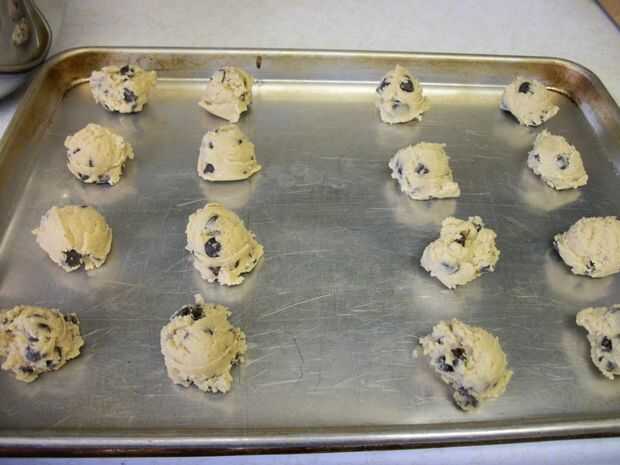 Mis cuadros muestran una cucharada de galleta, pero no tienes que tener uno. Sólo hace más fácil conseguir galletas tamaños uniformemente. Sacar cucharadas/medidas de masa y uniformemente sobre tu hoja de cookie. Me gustaría dejar al menos 2 pulgadas entre cada cucharada para que no funden. Al llegar al final de la tanda, no podría tener suficiente masa para llenar completamente el recipiente. Poner lo que te queda uniformemente en la bandeja. Si tengo por lo menos 4 galletas puse en las esquinas y luego rellenar a partir de ahí. Si solo tengo 2 o 3 de la izquierda, les pongo en el medio. Esto les ayudará a cocinar más uniformemente y distribuir el peso en tus galletas para no deforma el pan.