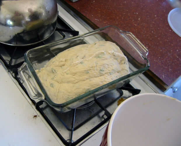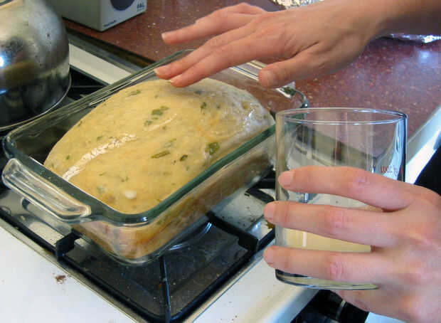 (Nota: la receta del NYT recomienda el uso de un "grande, pesado cubierto pot" como una olla para cocer el pan. Si ya tienes uno, use He oído que funciona bien. No tengo uno, así que en lugar de otro que utilizar moldes para pan regular, cúbralos con papel y un plato bajo del agua en la parte inferior estante del horno.)