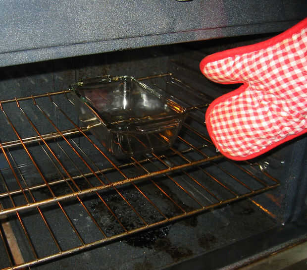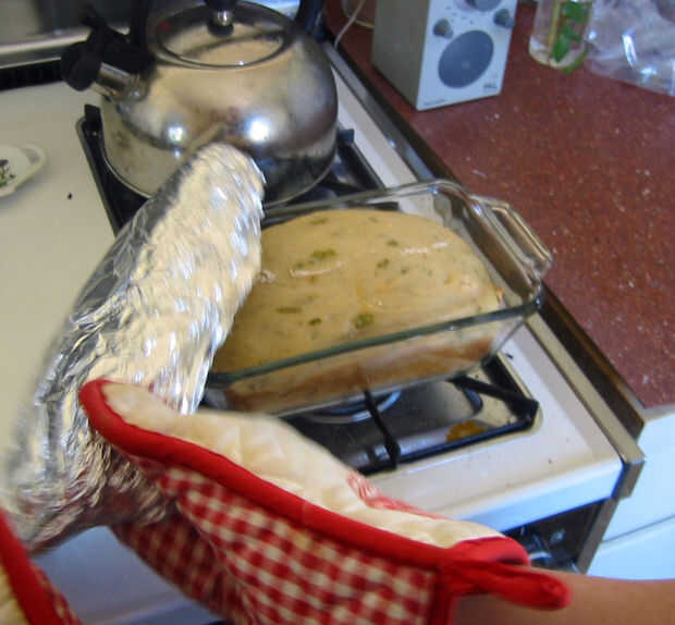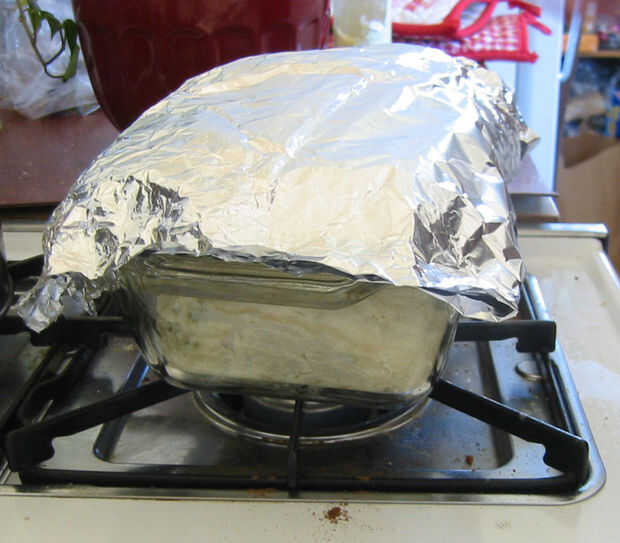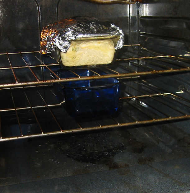 Cubrir el molde con papel de aluminio (otra vez, usando los guantes ya que el molde está caliente). Fijar el molde en la rejilla media del horno y poner un plato de ovensafe con 1/2"- 1" de agua en él en la parrilla inferior del horno. (Estoy haciendo esto porque no estoy usando un bote con una tapa pesada para mantener la humedad cerca del pan.)