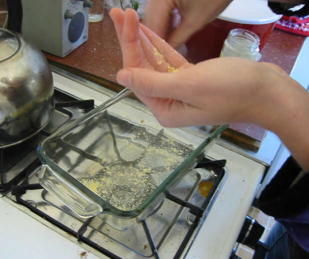 Cuando la masa esté lista, retire con cuidado el molde del horno. (Recuerde, van a estar muy calientes!) Espolvorear un poco de harina de maíz en el fondo del recipiente. Esto que el pan no se pegue y hacer mucho más fácil de desmoldar después.