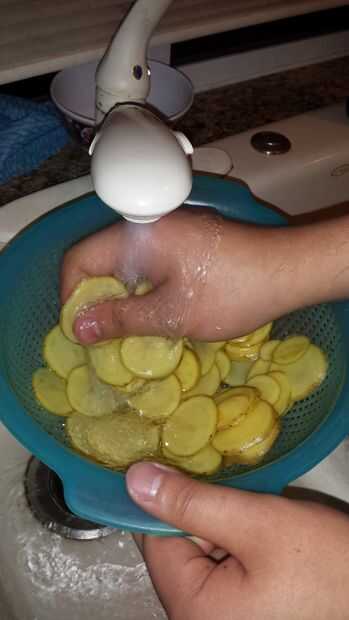 Una vez finalizado el corte y corte, tome el tamiz de la cesta lleno de las patatas en rodajas y ejecutarlos a través de agua fría. Enjuague bien para remover almidón de la patata.