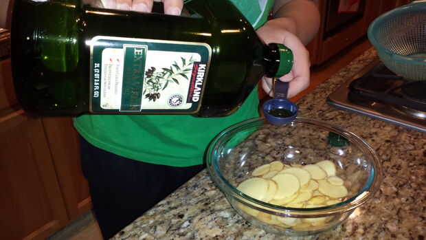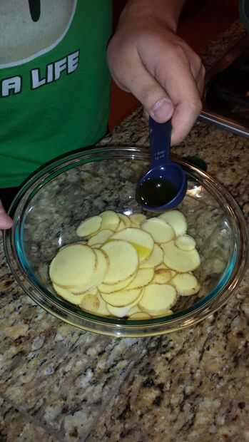 Tomar su medidor y medir una cucharada de aceite de oliva. Luego verterlo en el tazón grande de rodajas de patata. Mezclar bien los ingredientes en el tazón de fuente. El aceite de oliva debe ser suficiente para cubrir las rebanadas. Si usted necesita más, agregue lentamente en el proceso. Se ha añadido otra 1/2 cucharada de aceite de oliva en mi mezcla.