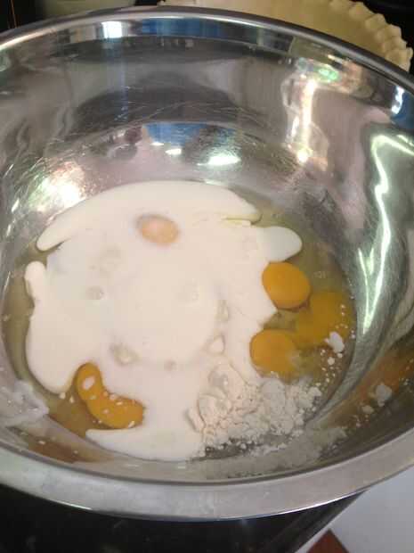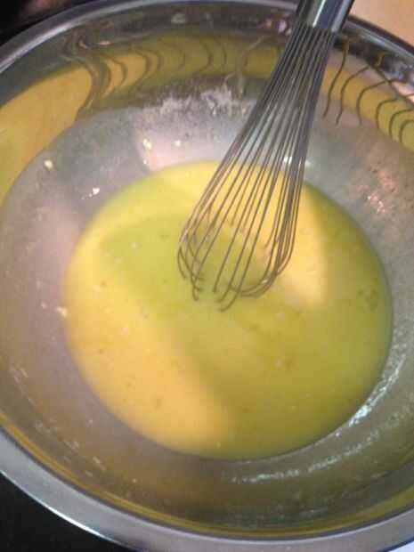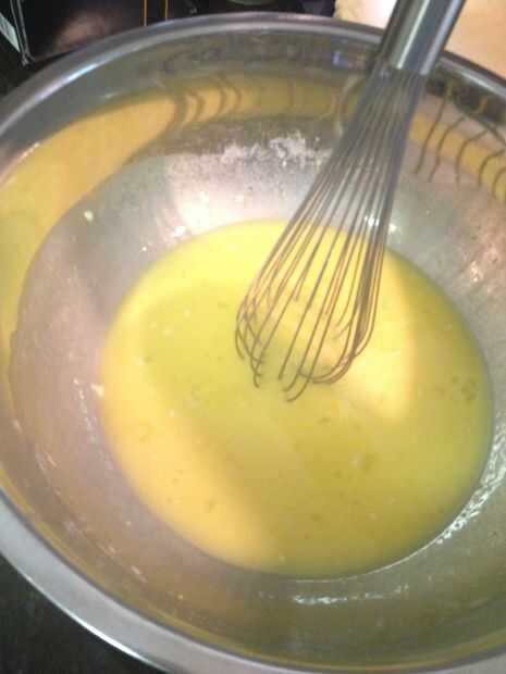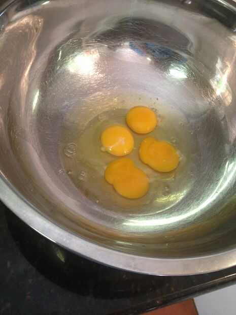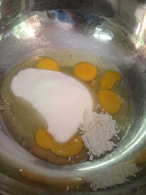 Combinar los 4 huevos, azúcar, harina y mantequilla en un tazón grande.