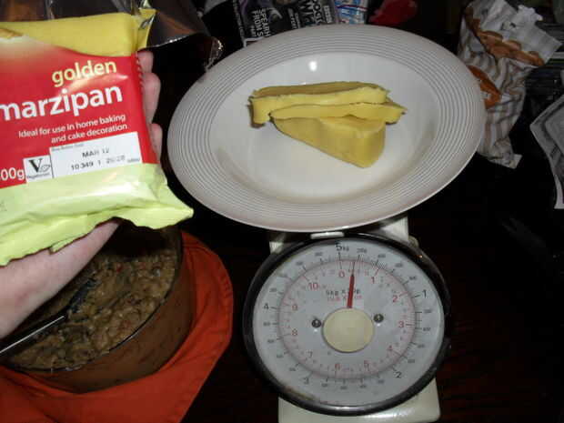 Mientras su familia stir y deseo, estirar sobre un medio barra de mazapán para el tamaño de la lata de pastel, mina es un poco menos de 8" de diámetro, como no quería que el mazapán para tocar los lados de metal (otra cosa que sería palillo)
