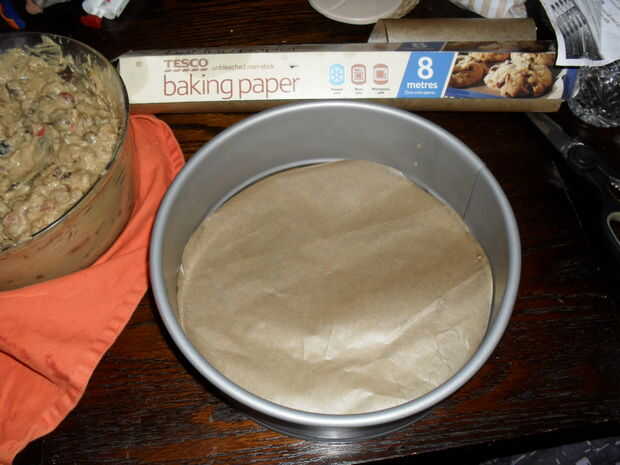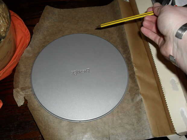Para asegurarse de que tu pastel no se pega, siempre pongo un círculo de pergamino en la parte inferior de la lata... Lo mejor es dibujar en la parte inferior de la lata en el pergamino, luego córtelo hacia fuera.