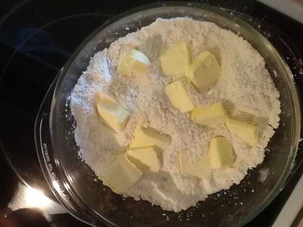 Coloque la harina, el azúcar y la sal en un bol y combinar. Esparcir los trozos de mantequilla en la mezcla de harina y frotar con los dedos hasta que se asemeja a la harina gruesa de amarillo.  Salpique el agua y revuelva con una cuchara de madera hasta que quede una masa bien lisa. Formar una bola con la masa y envolver en papel plástico. Refrigere por 1 hora.