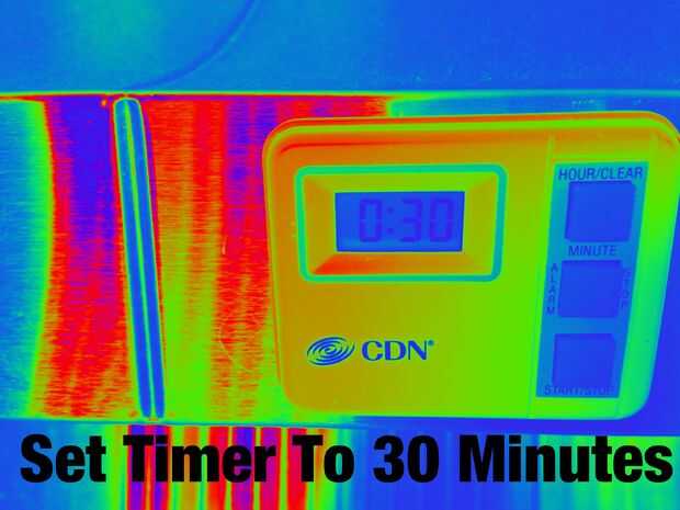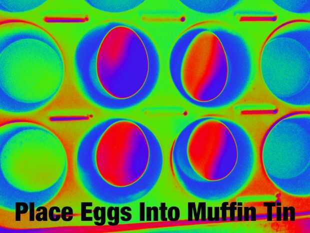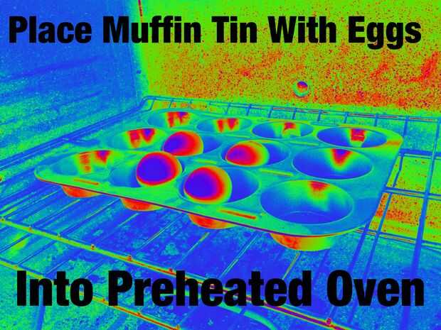 1. precalienta el horno a 325 grados. 2. ajuste el temporizador a 30 minutos 3. colocar huevos en un molde de muffin limpio. 4. cuando se calienta el horno, poner la lata en e iniciar el temporizador.