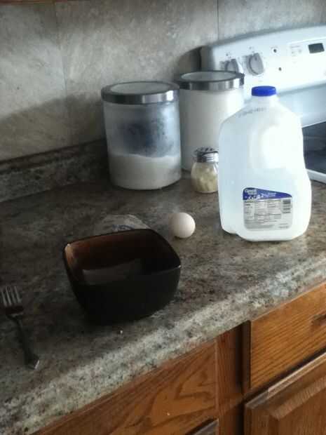 Un tenedor, un palo de mantequilla, una taza, un huevo y leche. Asegúrese de que el recipiente es para microondas!