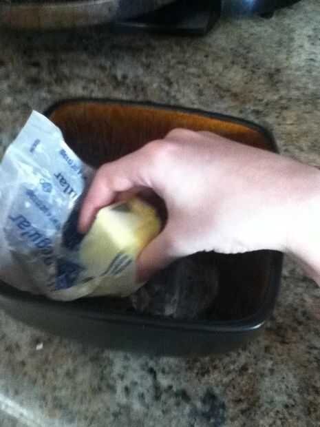 Como usted sabe, desenrolle un poco el palillo de la mantequilla y frotar alrededor de la taza así.