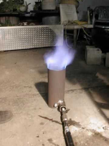 6. manual piloto y la seguridad de la llamarada. Para ayudar a quemar el alquitrán y humo de vapor en la puesta en marcha, es bueno poner un soplete de propano de mano regular la entrada de la parte inferior de la hornilla de remolino. Esto mantendrá una buena flama piloto grande en donde el gas de síntesis entra en el quemador de remolino y mantenerla limpia hasta que la llama de gas de síntesis se sostenerse. La llamarada extra cubrir un montón de error, así como evitar gas incombusto flotando alrededor de su área de trabajo. Consigue un soplete de propano de la mano para que usted puede hacer esto.