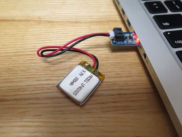 El día antes del taller y utilizar el pequeño cargador USB que viene con el kit completamente cargar cada batería. Un LED verde indica carga completa.