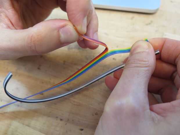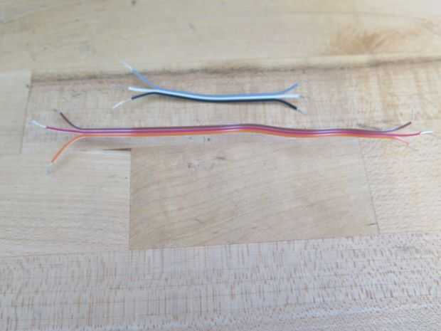 Pida a los estudiantes cáscara lejos dos conjuntos de tres cables cada uno desde la punta del cable de cinta incluida. Se deseche el mediados 4 hilos y sólo tiene que utilizar el marrón-rojo-naranja y el conjunto negro-blanco-gris.