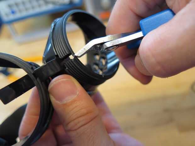 Busto de las gafas de plástico del kit. Lo primero que haremos es recortar de las lengüetas de plástico en las gafas. Este espacio es donde van los cables entre los dos ojos.