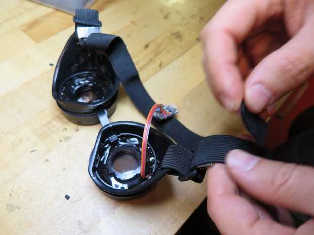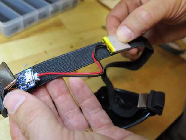 Usando velcro adhesivo, coloque pedazos de velcro a la banda elástica detrás de la cabeza, uno para el Abalorio y la batería. Luego adherir el velcro para la batería y el Abalorio (lado de la batería). Esto evitará que el Abalorio y la batería en tus gafas en vez de colgando flojamente.