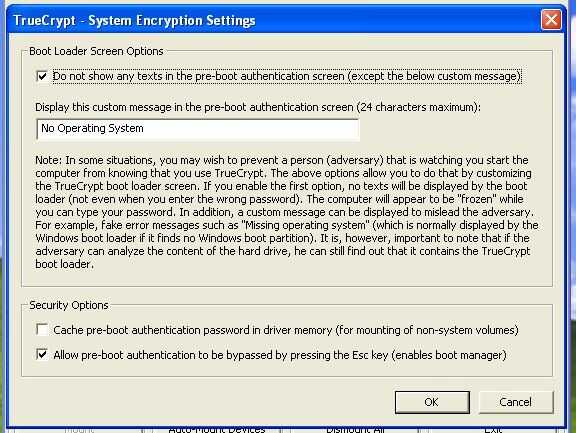 Se puede cambiar la pantalla de autenticación predeterminada Truecrypt. Un mensaje personalizado puede utilizarse como la pantalla de autenticación. Un posible uso de esta es ocultar la existencia del sistema operativo. Si tienes un mensaje de "falta sistema operativo" se verá como si no se instala ningún sistema.