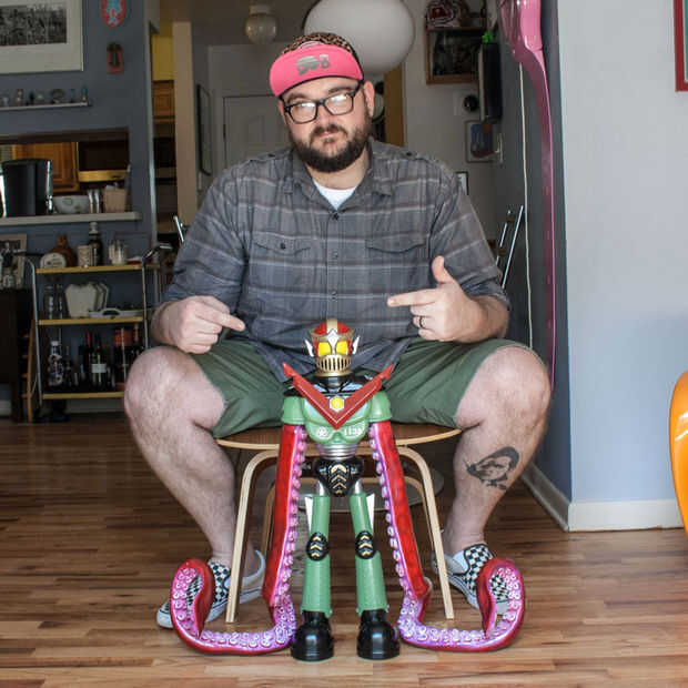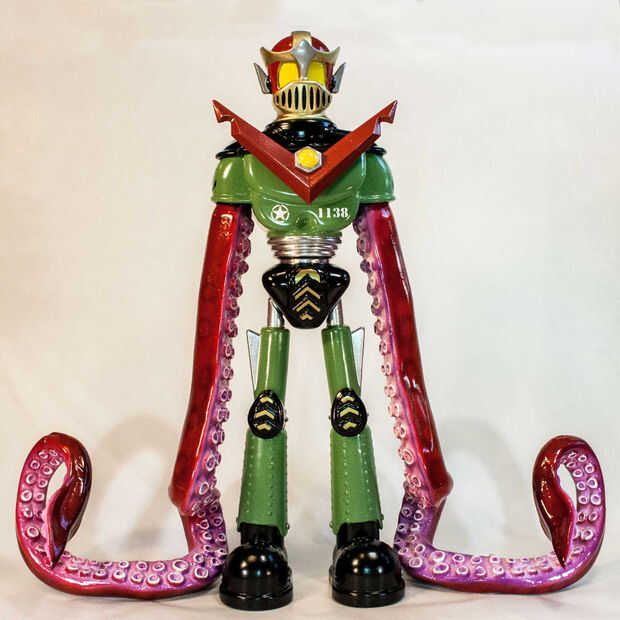 La máquina se sentó en mi estudio casero durante un mes o así, bombeando impresiones poco aquí y allá. Decidí darle una verdadera prueba creó un modelo digital de un robot con tentáculos que había dibujado casi 10 años antes y lo impreso. Me sorprendió bastante lo bien que resultó. Fue casi al mismo tiempo que recibí una invitación de última hora para participar en un show local en Galeria de juguetes personalizados. Pensé que esto era una gran oportunidad para mi robot hasta tamaño Jumbo Ubktbimmer1 de escala y dar a esta impresora barata una verdadera prueba.