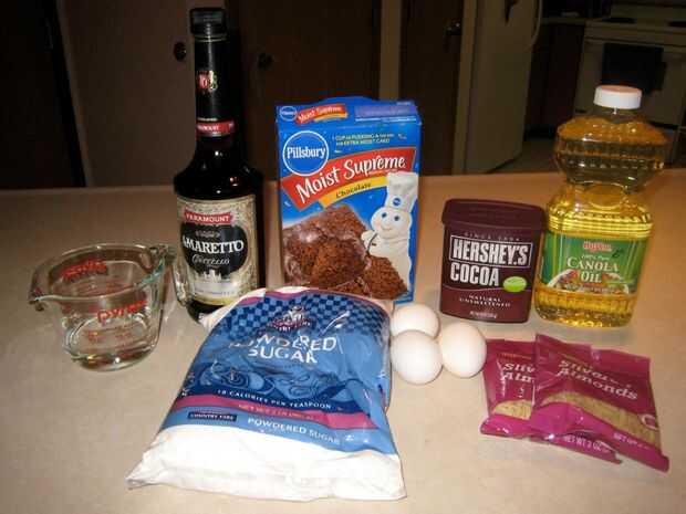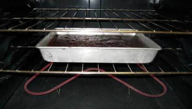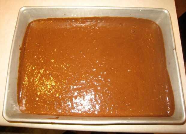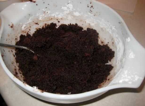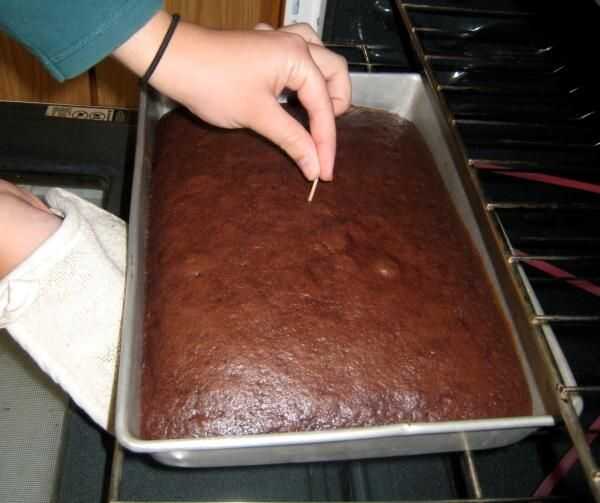 1) hornear una mezcla de pastel de chocolate según las instrucciones del envase utilizando la mezcla de huevos, agua y aceite.